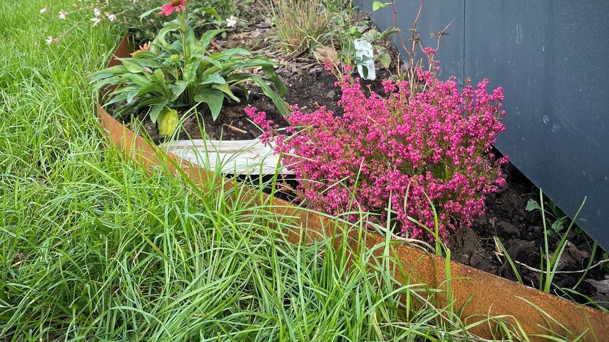 Ocelové obrubníky kolem záhonu s okrasnou výsadbou