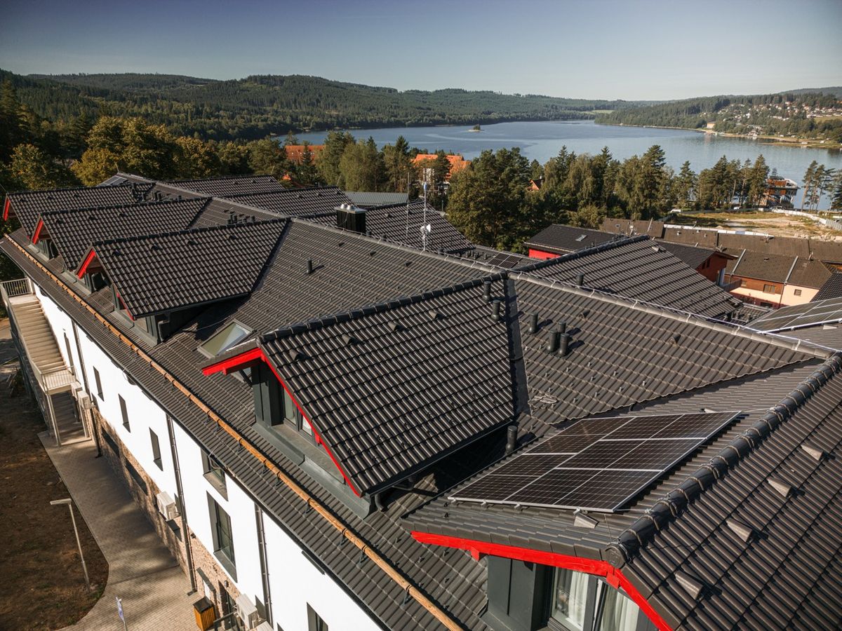Střešní tašky lze využít i při stavbě bytových domů, příkladem je projekt Korzo Lipno.
