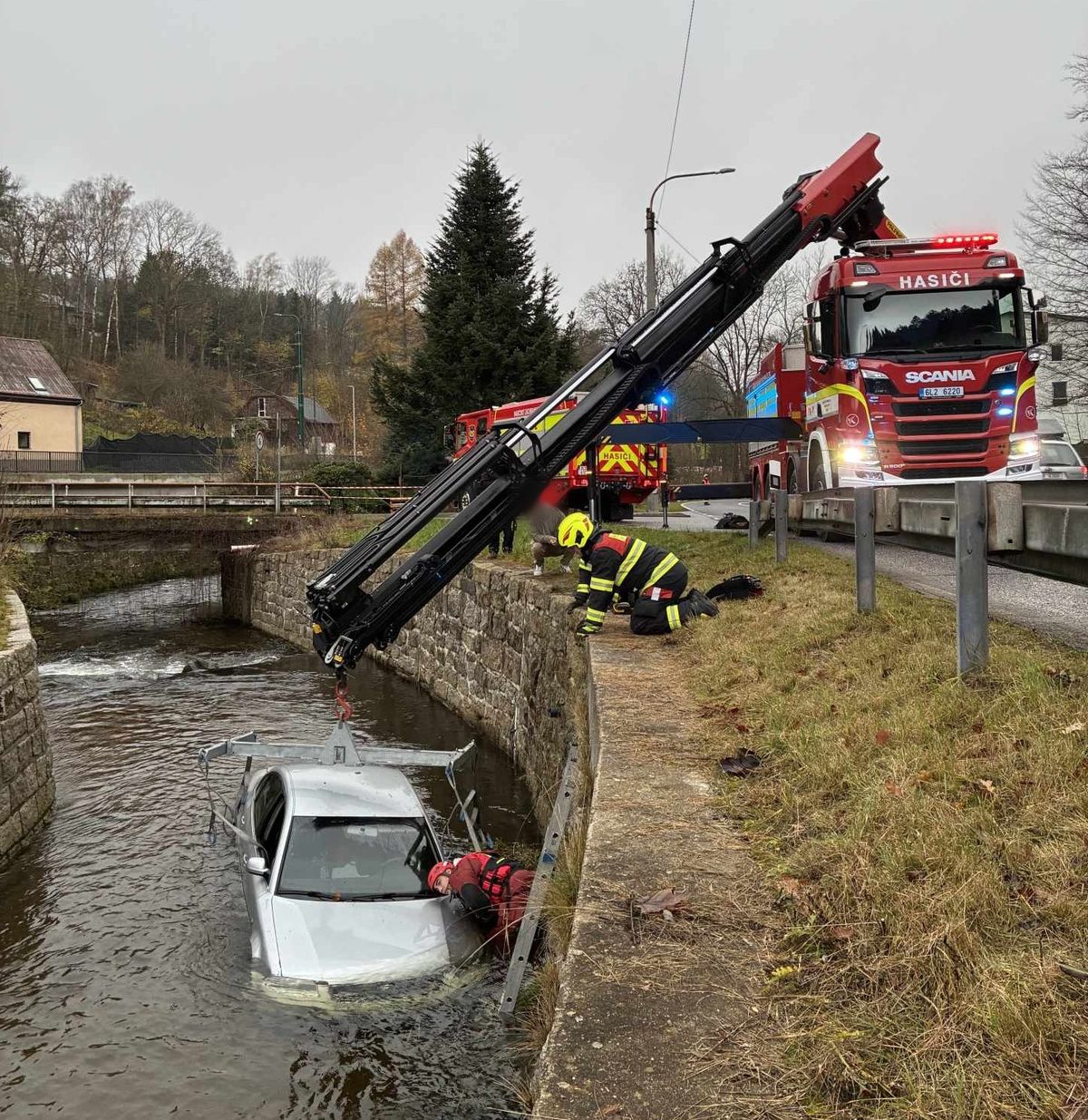 Na místo nehody vyjížděli hasiči v úterý pár minut před sedmou ráno. Po příjezdu na místo našli auto zanořené do vody v korytě řeky a řidiče, který byl bez zranění a už mimo vozidlo.