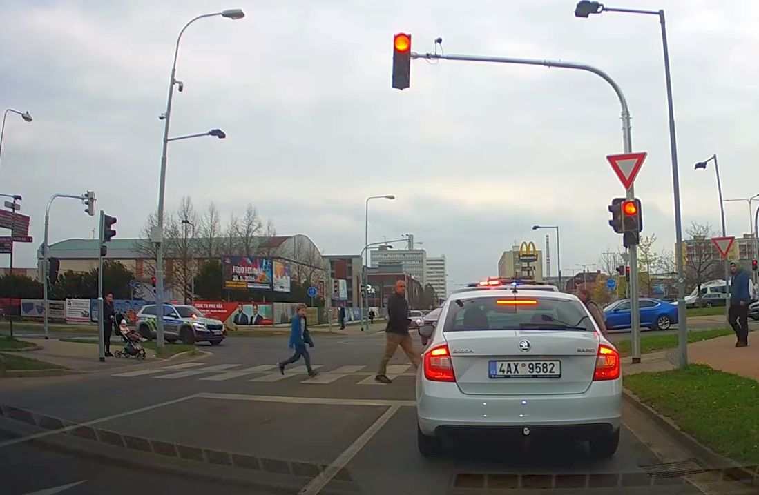 Ze záznamu není kvůli hlasité hudbě zřejmé, zda služební auta i houkala a zda měli chodci zelenou nebo červenou. Do vozovky každopádně vstupovat neměli.
