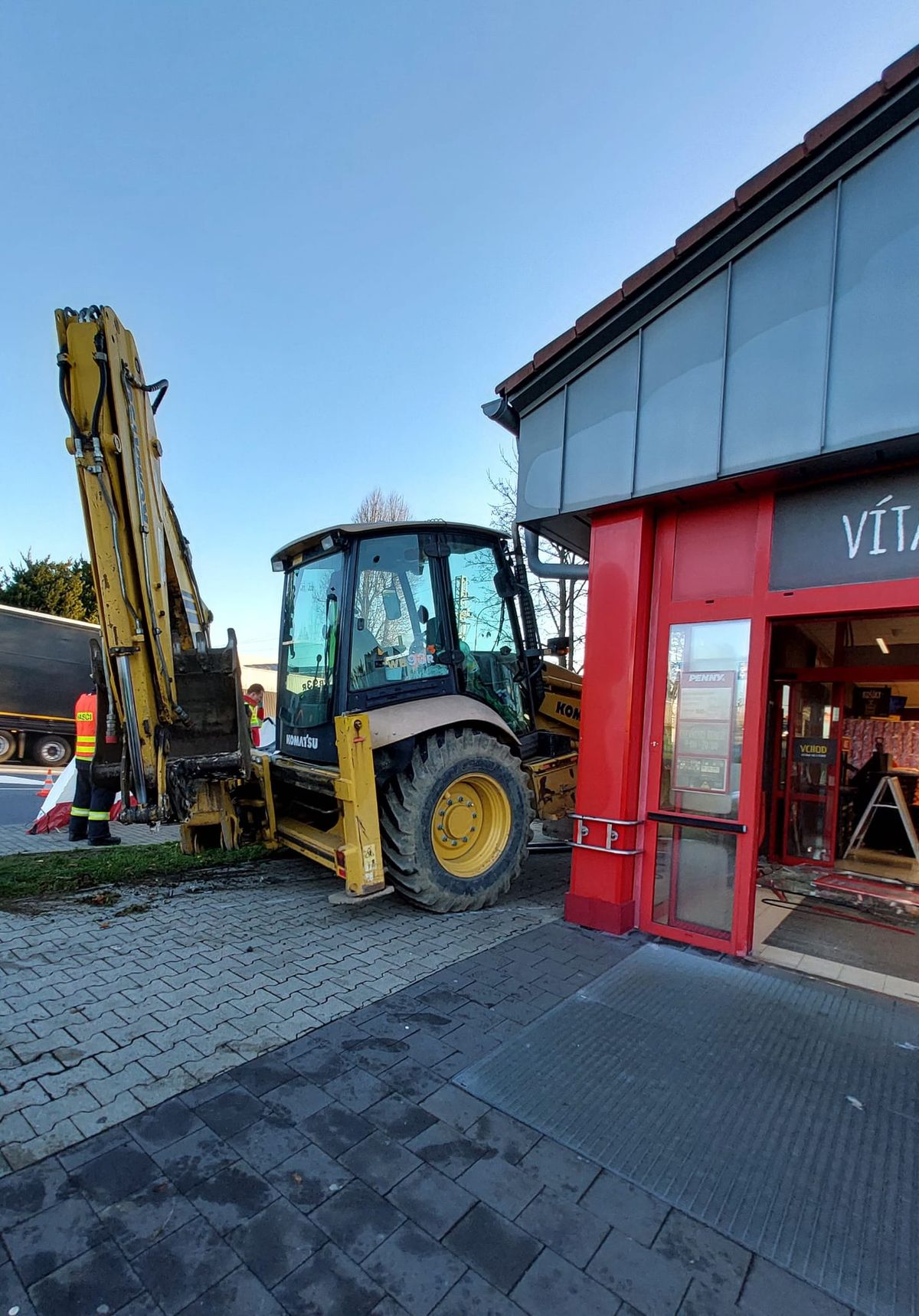 Řidič s bagrem narazil do supermarketu v Havlíčkově Brodě.