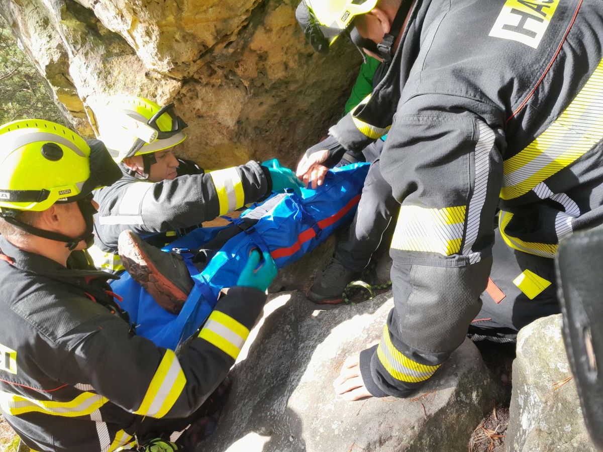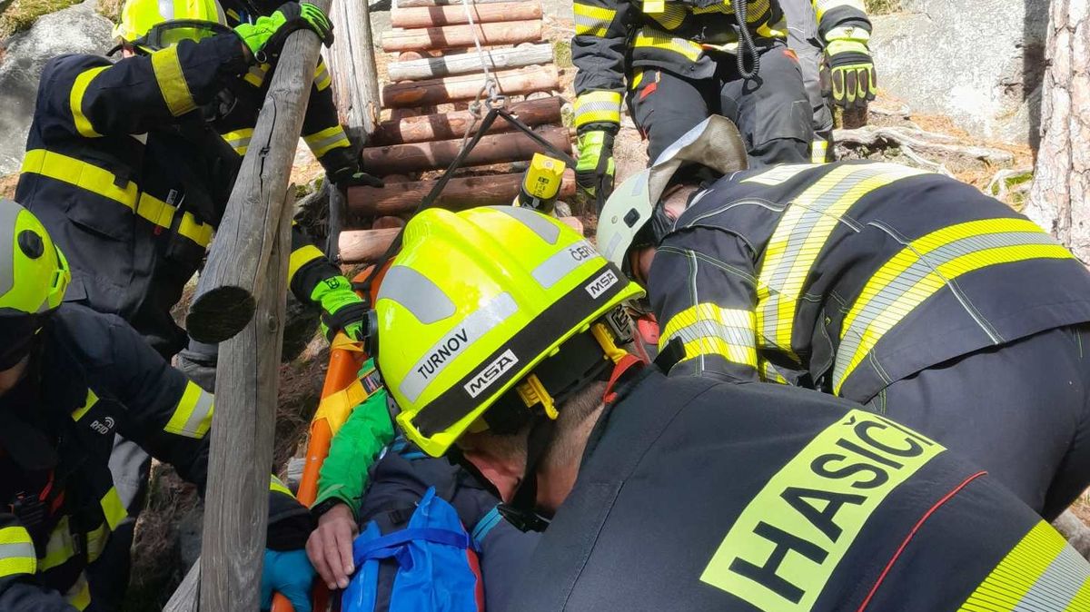 Na pomoc zraněnému vyjížděly dva týmy hasičů do Besedic, do Suchých skal v neděli dopoledne. Protože jde o náročný skalnatý terén, připojili se k nim i lezci ze Semil.