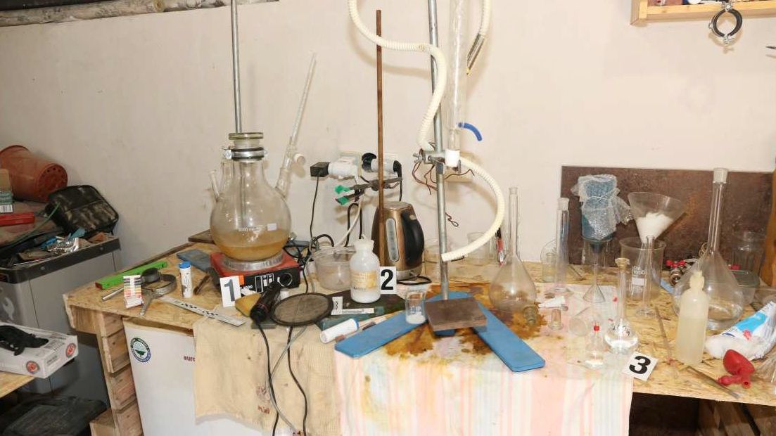 Kriminalisté v garáži u domu objevili laboratorní sklo a chemikálie, jako například červený fosfor nebo kyselinu fosforečnou, které se využívají k výrobě drog.