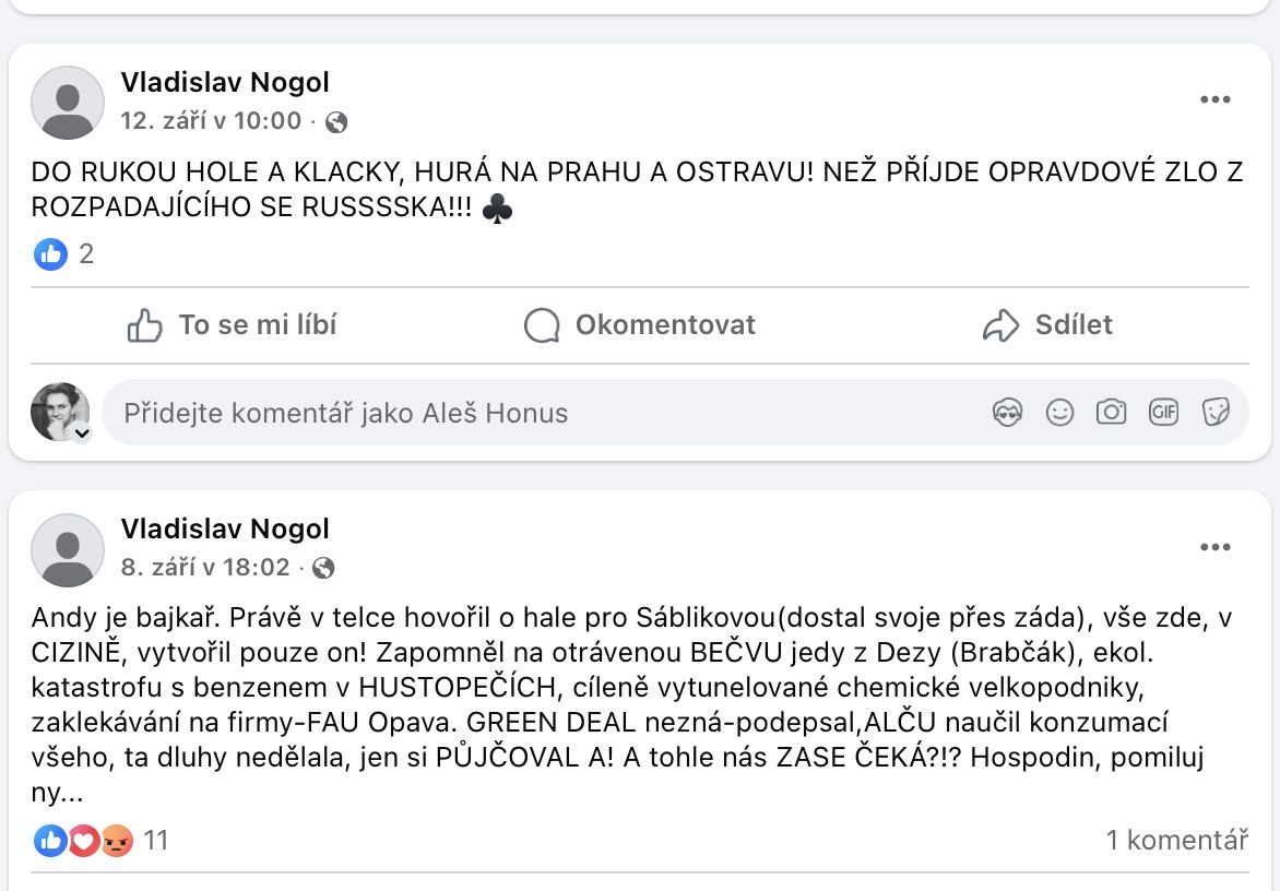 „Do rukou hole a klacky, hurá na Prahu a Ostravu, než přijde opravdové zlo z rozpadajícího se Russsska,“ napsal Vladislav Nogol už v polovině září, po pouhých dvou týdnech od incidentu. Ovšem ještě předtím, než mu policie sdělila podezření z pokusu o těžké ublížení na zdraví a z výtržnictví.