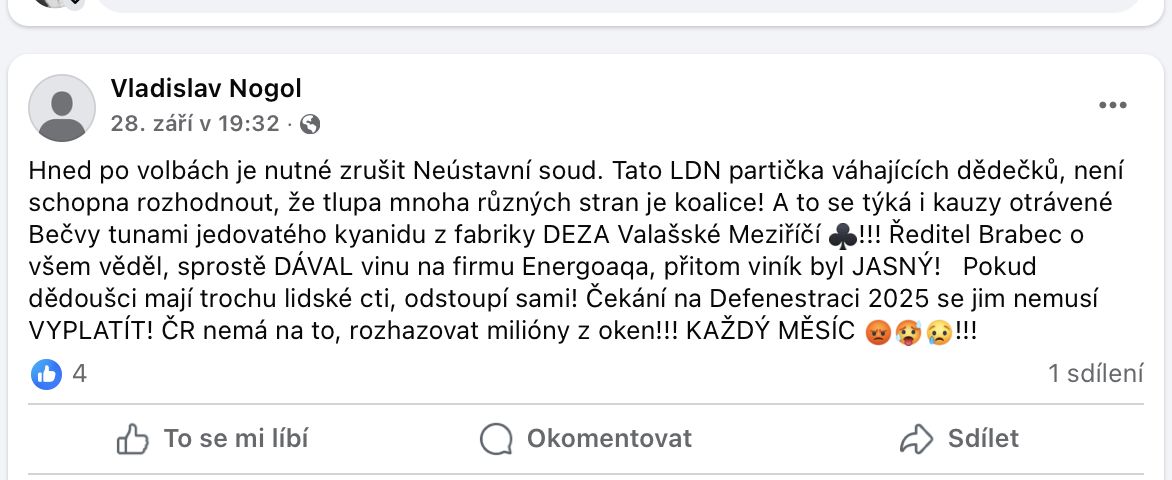 „Hned po volbách je nutné zrušit Neústavní soud. Tato LDN partička váhajících dědečků není schopna rozhodnout, že tlupa mnoha různých stran je koalice! A to se týká i kauzy otrávené Bečvy tunami jedovatého kyanidu z fabriky Deza Valašské Meziříčí! Ředitel Brabec o všem věděl, sprostě dával vinu na firmu Energoaqua, přitom viník byl jasný! Pokud dědoušci mají trochu lidské cti, odstoupí sami. Čekání na Defenestraci 2025 se jim nemusí vyplatit,“ napsal v neděli 28. září.