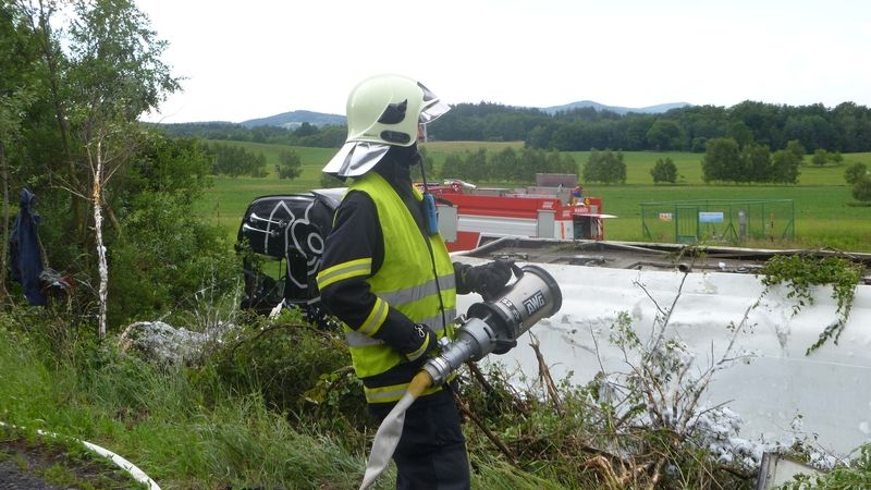 Kolik benzínu do pole vyteklo, nedokázali hasiči v neděli odpoledne říci. „Cisternu jsme pomocí dvou Tater postavili na kola, ale pravá přední nádrž je proražená. Otvor jsme už utěsnili a nyní čekáme, až sem přijede z Vyškova náhradní cisterna, do níž si majitel přečerpá obsah té havarované,“ řekl Právu na místě nehody velící důstojník libereckých hasičů Petr Štajnc.