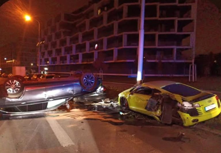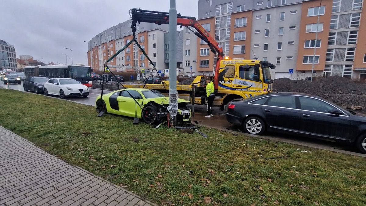 U nehody zasahovali v pondělí po třetí hodině ráno pražští hasiči a policisté. Řidič vozu značky Mercedes při ní naboural do dvou zaparkovaných vozů značky Audi. Podle snímku, který zveřejnili hasiči na sociální síti, mělo žluté Audi R8 silně poničenou levou zadní část a předek mělo naražený na sloupu. Mercedes skončil koly vzhůru.