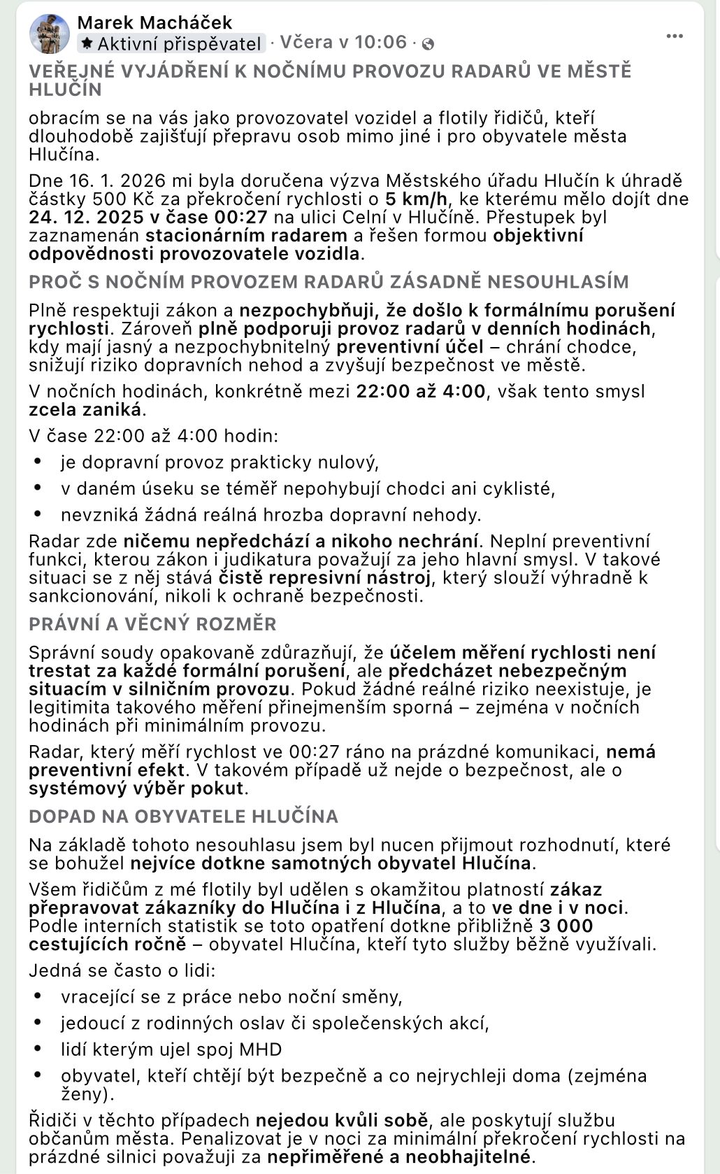 „Plně respektuji zákon a nezpochybňuji, že došlo k formálnímu porušení rychlosti. Zároveň podporuji provoz radarů v denních hodinách, kdy mají jasný a nezpochybnitelný preventivní účel – chrání chodce, snižují riziko dopravních nehod a zvyšují bezpečnost ve městě. V nočních hodinách, konkrétně mezi 22:00 až 4:00, však tento smysl zcela zaniká,“ napsal Roman Macháček, který podle svých slov zodpovídá za flotilu několika aut.