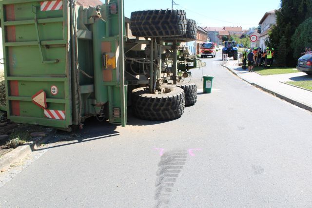 „Při jízdě pravotočivou zatáčkou u jednoho z místních domů zřejmě nepřizpůsobil rychlost a došlo k převrácení přípojného vozidla na komunikaci. Tím došlo k poškození svislého dopravního značení, elektrické skříně, obrubníku a pozemní komunikace,“ informovala v pátek policejní mluvčí Miluše Zajícová.