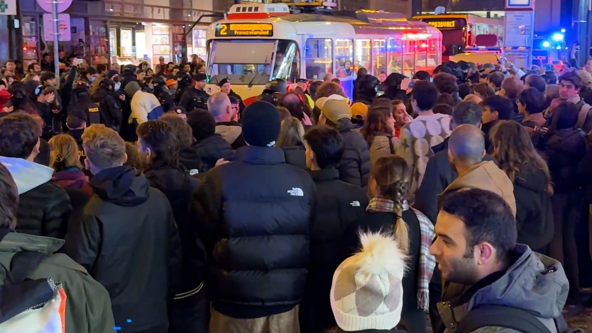 Tramvaje zablokovala nepovolená demonstrace v zastávce Národní třída. Na koleje si před tramvaje sedlo několik desítek lidí. Kromě velkého nápisu s větou „Izrael páchá genocidu“ měli palestinské vlajky. Většina z nich měla zakryté obličeje, nejčastěji rouškou.