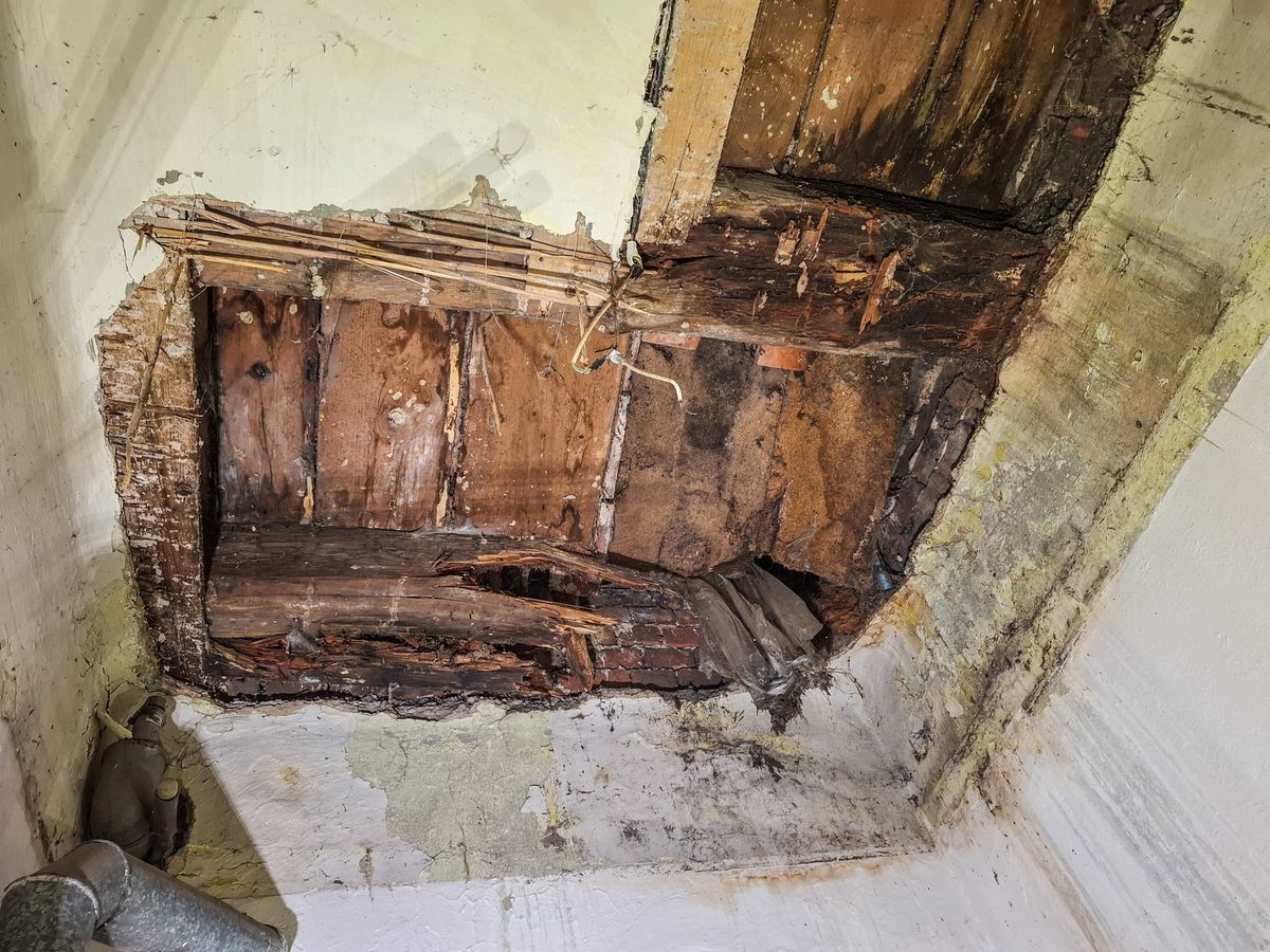 Po pádu podhledových konstrukcí zůstaly na stropě obnažené trámy