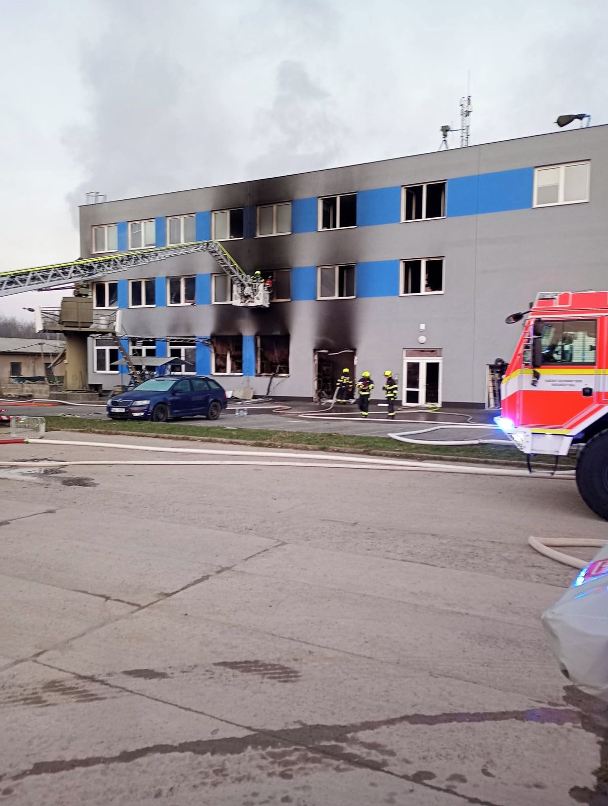 Na administrativní budovu se požár přenesl, je také poničená.
