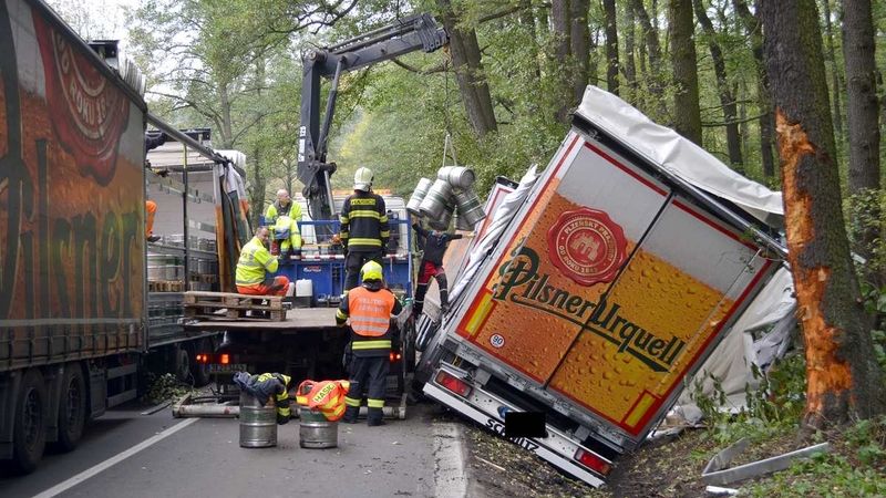Převrácený kamión se sudy piva blokoval silnici do Karlových Varů od Plzně.