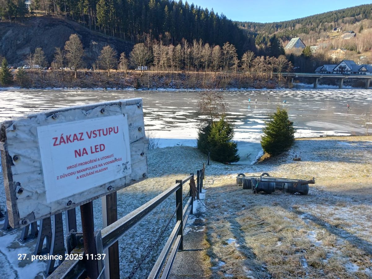 Cedule se zákazem vstupu na led na břehu přehrady Labská.