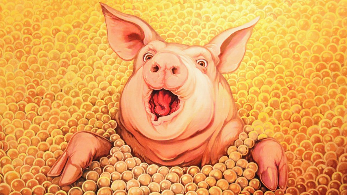 Když už mluvíme o prasatech, i na Jílkově výstavě toto zvíře najdeme. Olej na plátně Házet perly sviním (2026) ukazuje vypaseného růžového vepře, který se topí v hromadě perel jako v tekutých píscích. Nezřízené bohatství ho nemilosrdně stahuje ke dnu.