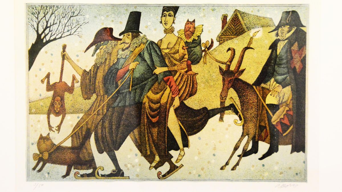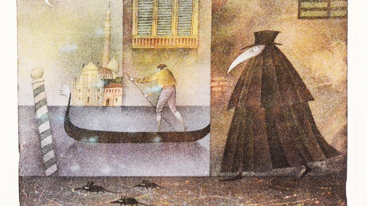 Díky svému malířskému i kreslířskému mistrovství, smyslu pro dynamiku figury a absolutní preciznosti detailu vytvořil scenérie, které jako kdyby pocházely z přízračných dob. Taková je třeba litografie Večer v Benátkách (1994), na níž je tajemství vyjádřeno mužem v černém plášti, s bílou maskou na tváři. Stojí skrytý u zdi, zatímco po kanálu pluje líně gondola a vše pozoruje srpek bledého měsíce. Výše zmiňovaný tajemný přízrak se objevuje i jinde (Představení v Benátkách, 1995) a stává se sám gondoliérem plujícím v dešti ve vodách kanálu.