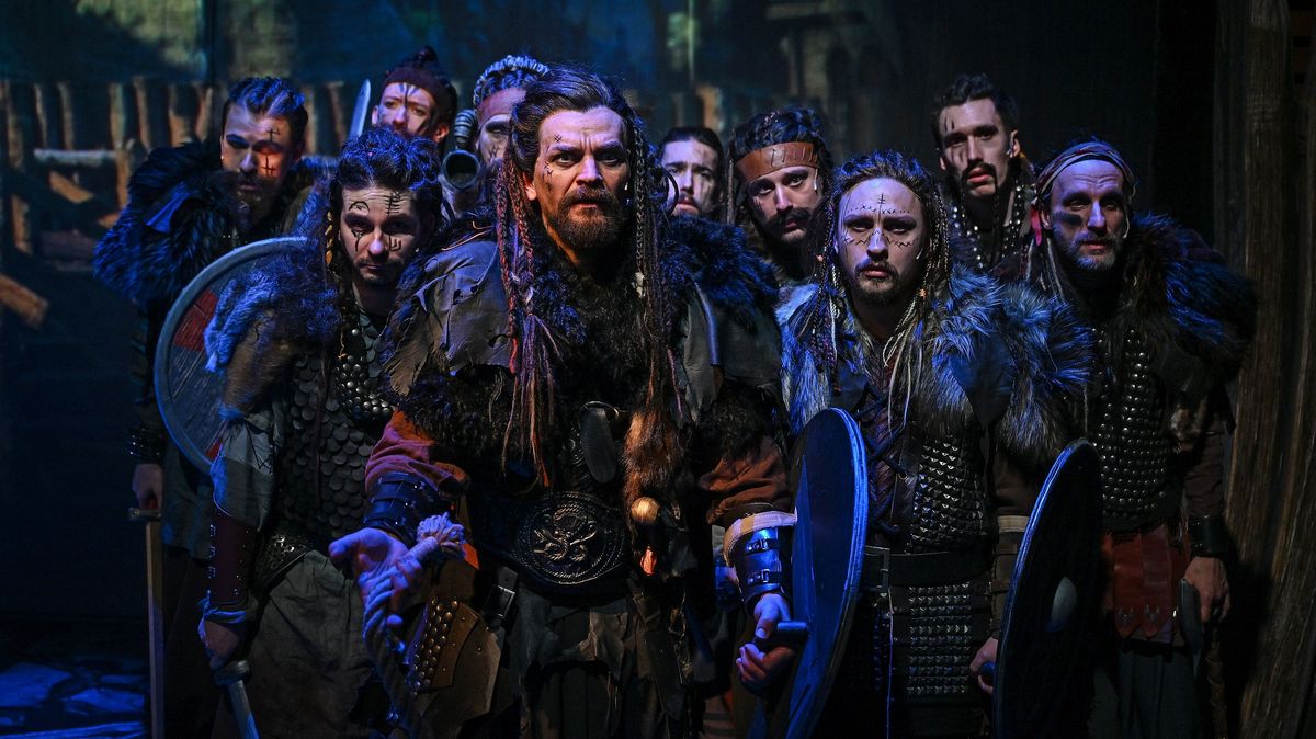 Dramatická scéna s Johanem (Jakub Mauer), který předvádí vikingského bojovného ducha strýci Haftorovi (Robert Jícha) a jeho přátelům.