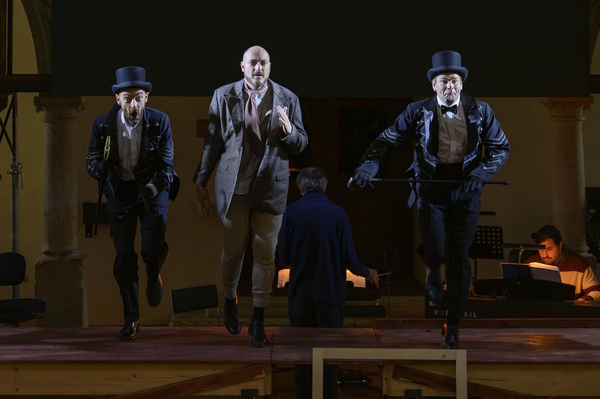Zleva Josef Škarka, Jiří Hájek (Josef K.) a Martin Javorský v inscenaci Glassovy opery Proces