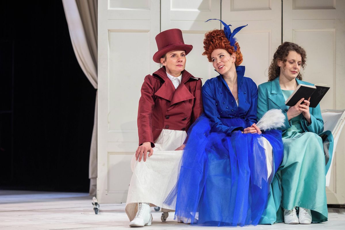 Zleva Veronika Korytářová (Darcy), Eliška Jansová (Caroline) a Kateřina Kornhäuserová (Elisabeth) v liberecké inscenaci Pýcha a předsudek