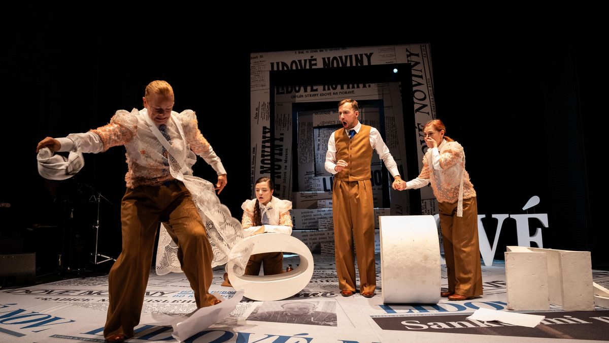 V brněnské inscenaci se také seznámíte s Adolfem Hitlerem (hraje ho vynikající Tereza Groszmannová), estebáky a disentem, Andrejem Babišem, Jindřichem Šídlem, inzerenty, o nichž se nepíše, s politiky, o nichž se píše, ale bylo by lepší, kdyby se o nich nepsalo, s roboty i běžnými novináři, kteří se ze všech sil snaží v branži uživit.