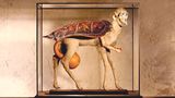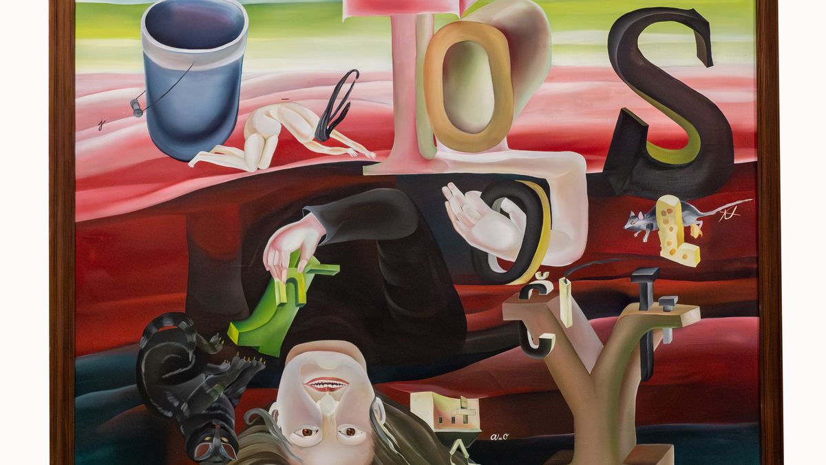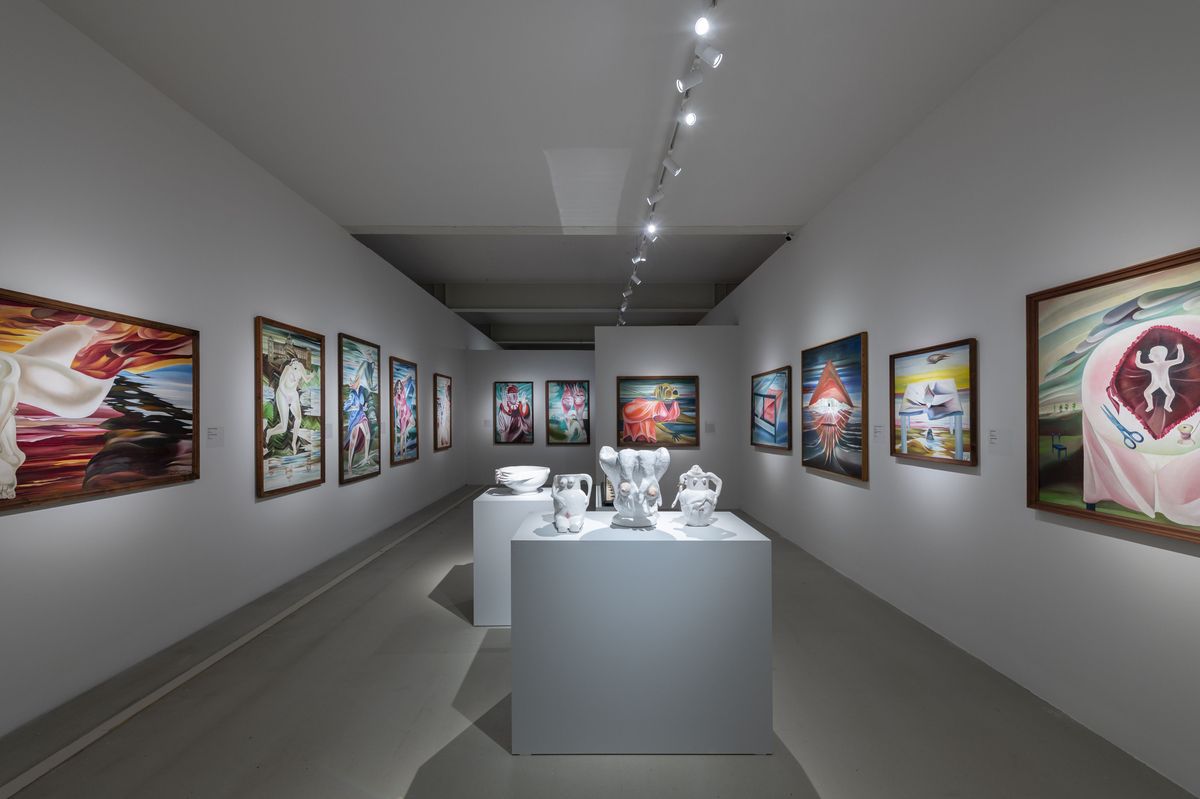 Výstava Evy Švankmajerové v centru DOX. V popředí keramické objekty Sedící džbán, Konec talíře a Pracující džbán