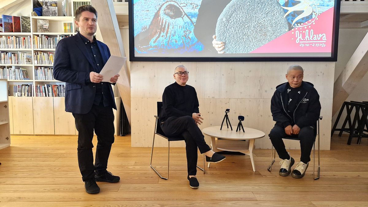 Šéf festivalu Marek Hovorka, režisér Tsai Ming-liang a herec Lee Kang-sheng na tiskové konferenci v Jihlavě
