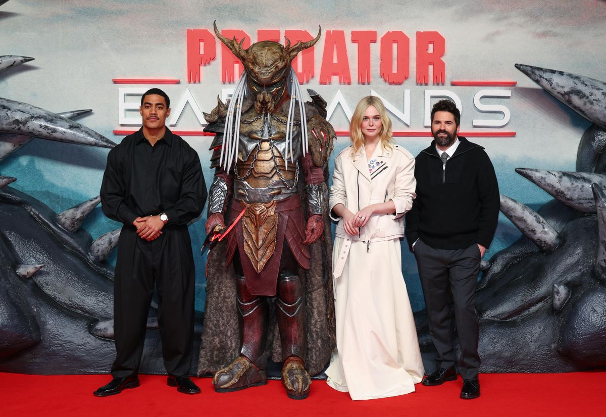 Režisér Dan Trachtenberg (vpravo) s hvězdami nového dílu série Predátor, Dimitriusem Schusterem-Koloamatangim a Elle Fanningovou