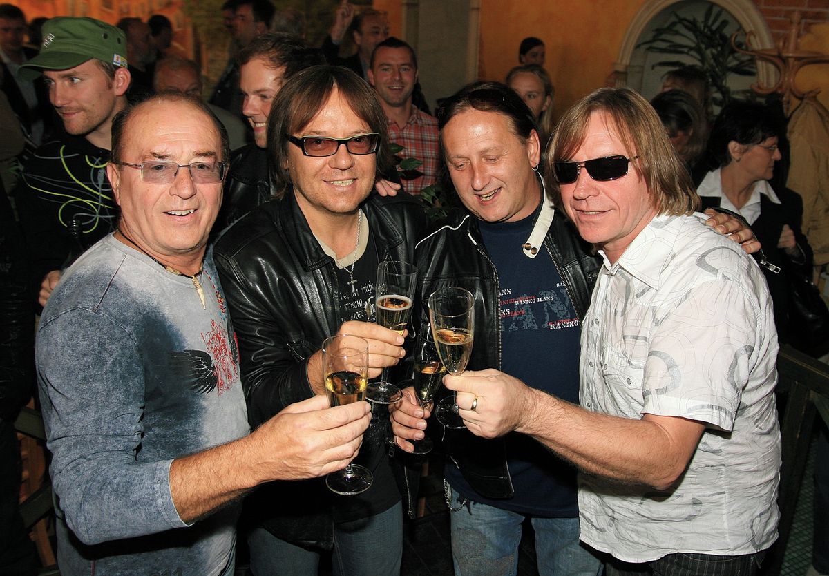Olympic s Jiřím Valentou (druhý zleva) a Milanem Peroutkou (druhý zprava) v roce 2007 při křtu svého alba Sopka.