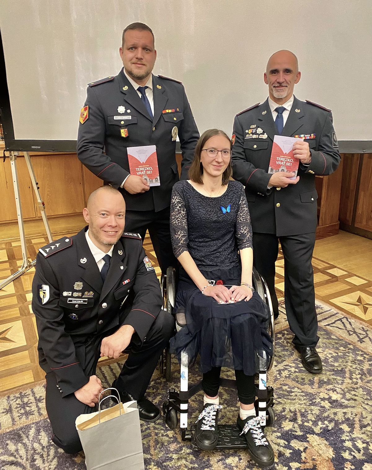 Terezka v doprovodu Karla, Adama a Radomíra (zleva). Tito tři policisté mezi mnoha ostatními 21. prosince 2023 zachraňovali na Filozofické fakultě Univerzity Karlovy zraněné studenty.
