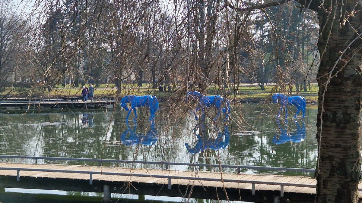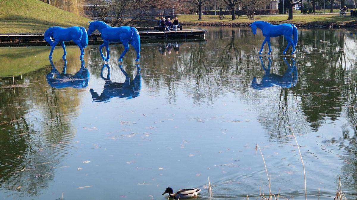 Pro sousoší Tři modří koně proto byla vybrána klidná vodní hladina jezírka v Šimkových sadech.