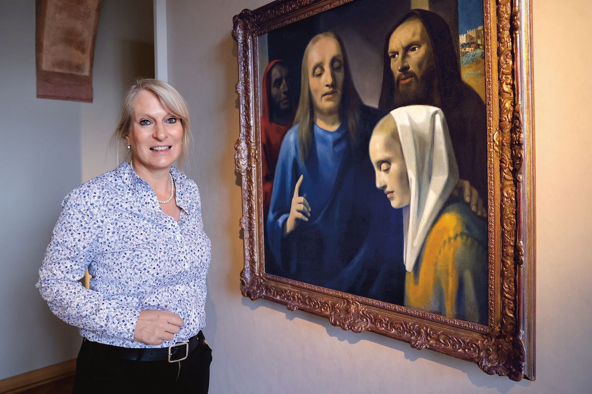 Ředitelka Sbírky starého umění Národní galerie Praha Olga Kotková s obrazem Kristus a cizoložnice, který namaloval Han van Meegeren. Kotková je od 23. března 2026 pověřena řízením NGP