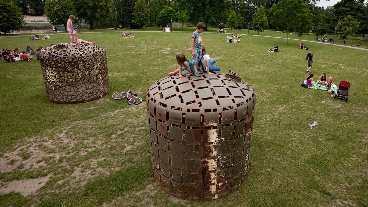Ocelová obydlí jsou ze starých vyřazených cisteren, které jsem přepůlil, a pomocí plazmy do nich vyřezával geometrické otvory. Celkem je na Náplavce šest objektů a vizuálně připomínají jurtu nebo iglú. Původně sloužily jako obří zásobníky na vodu, pivo, víno, benzín.