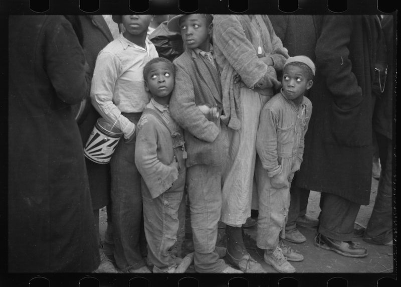 Walker Evans, Arkansas, Forrest City. Lidé, kteří přišli o domov během povodní, čekají na jídlo, Únor 1937