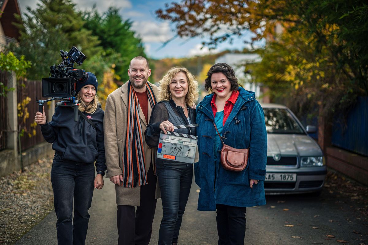 Z natáčení seriálu Spřízněná duše - zleva kameramanka Yvon Teysslerová, Jakub Prachař, režisérka Tereza Kopáčová, Nataša Bednářová