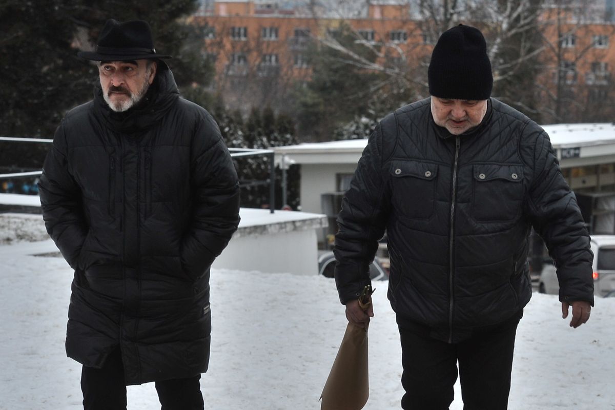 Poslední rozloučení s hercem Pavlem Nečasem, 9. ledna 2026, Ústřední hřbitov, Brno. Na snímku vlevo herec Jan Kolařík, vedle něj kolega Václav Svoboda.
