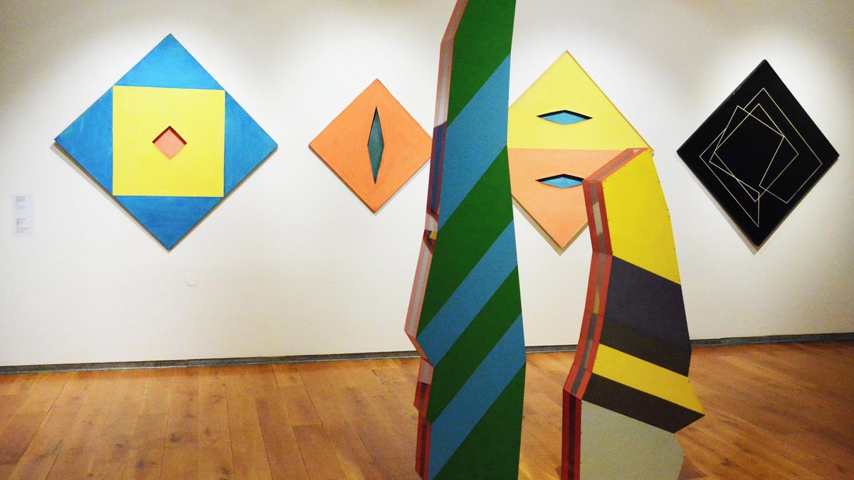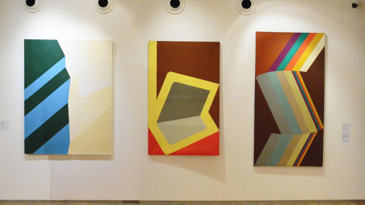 Dočkáme se ale i veselých barev. Rybkovo vidění dokonalosti modrého kruhu na žlutém podkladě nebo oranžová, šedá a červená linie zalomená na modré ploše ukazují zase oba umělce odlišně. Vystavené obrazy působí tak trochu jako kulisy z nějakého animovaného filmu. Tento dojem podporuje ještě mnohobarevný prostorový objekt, který vypadá jako duo pop artových menhirů. Právě tady je patrné, jak základní geometrické tvary zasazené do trojrozměrného prostoru mohou vytvořit fantaskní paralelní svět.