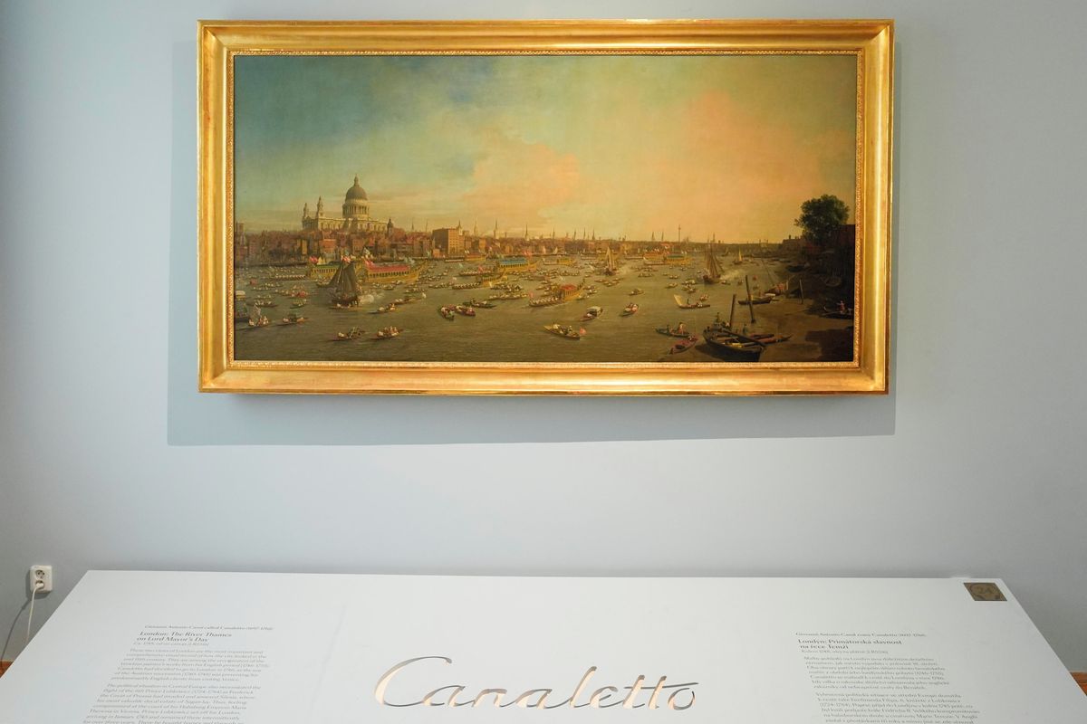 Pohnutý je přitom zejména osud toho druhého: Londýn: pohled na řeku Temži a Westminsterské opatství od paláce Lambeth. Za 2. světové války odjel z Prahy směrem Salcburk. Byl součástí nacistického „depozitáře“ nejvýznamnějších evropských uměleckých děl v nedalekých solných dolech. „Následně se do Československa vrátil. Po nacistech je ale oba znárodnili komunisté. Starala se o ně Národní galerie ČR,“ zmíní dále Baker.