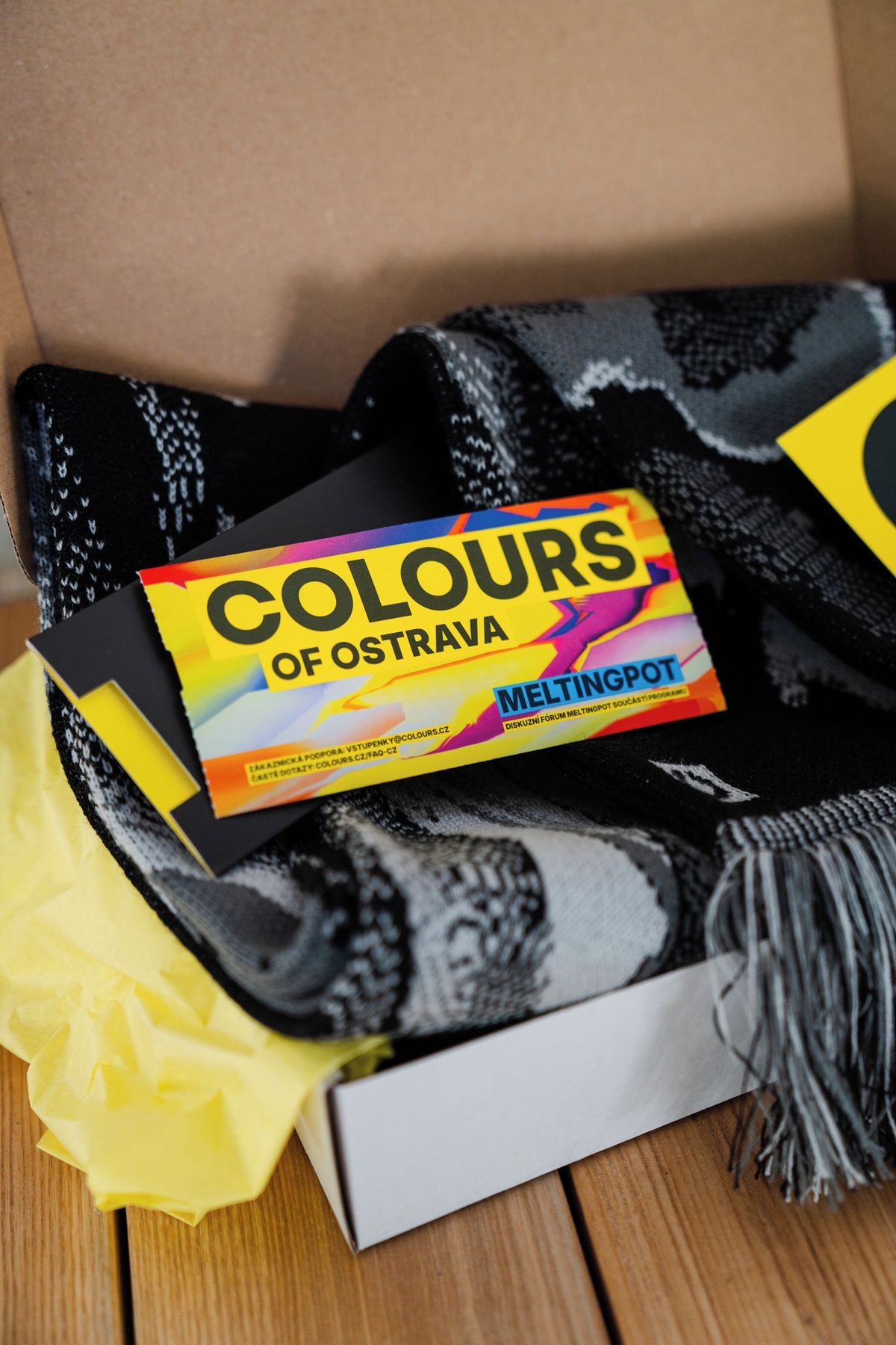 Vánoční balíček Colours nabízí stylovou zimní šálu a tištěnou vstupenku na festival jako originální a hmatatelný dárek pro fanoušky. Nemusíte ho ani balit, Colours of Ostrava si na něm dává záležet už při rozesílce.