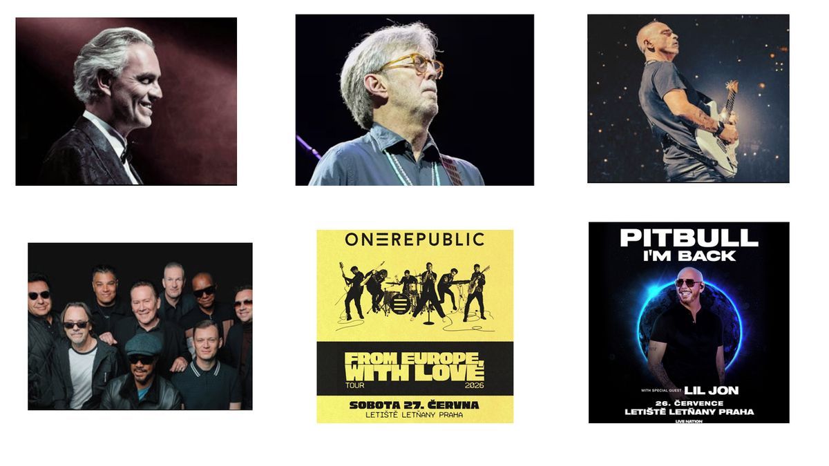 Vstupenky na koncerty: Andrea Bocelli, 23. - 24. 1. 2026 v pražské O2 areně; Eric Clapton, 4. 5. 2026 v pražské O2 aréně; Eros Ramazzotti, 10. 4. 2026, v O2 aréně, UB40, 13. 3. 2026 v pražském Forum Karlín, ONEREPUBLIC, 26. 6. 2026, Letiště Praha Letňany; Pitbull – I’m Back!, 26. 7. 2026, Letiště Praha Letňany.