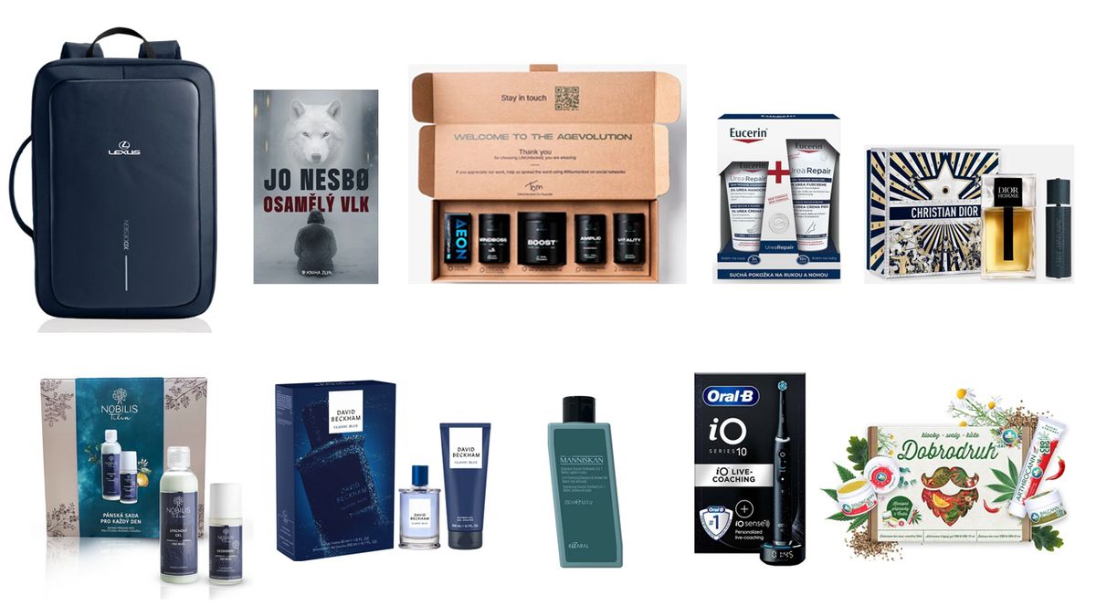 Lexus Batoh, který se dá přeměnit na aktovku, 3599 Kč; Kniha Osamělý vlk, od Jo Nesba, 494 Kč; LifeUnlocked Sada Ultimate Longevity Kit, komplexní sada doplňků stravy pro náročné, lifeunlocked.eu 4250 Kč; Eucerin UreaRepair dárková sada na ruce a nohy, 750 Kč; Dior Homme Set, limitovaná edice – Toaletní voda a cestovní sprej, Douglas 2799 Kč; Nobilis Tilia Šetrná přírodní péče pro citlivou mužskou pokožku - sprchový gel a deodorant, 539 Kč; David Beckham Classic Blue Vánoční kazeta pro muže, 549 Kč; Människan Posilující šampón a sprchový gel 3v1, na mytí o mytí vousů, vlasů i těla, viviane.cz 345 Kč; Zubní kartáček Oral-B iO Series 10 Black Spreckels, s umělou inteligencí, 6999 Kč; Annabis Dárková sada Dobrodruh, vše od regenerace kůže až po klouby, bionetta.cz 729 Kč