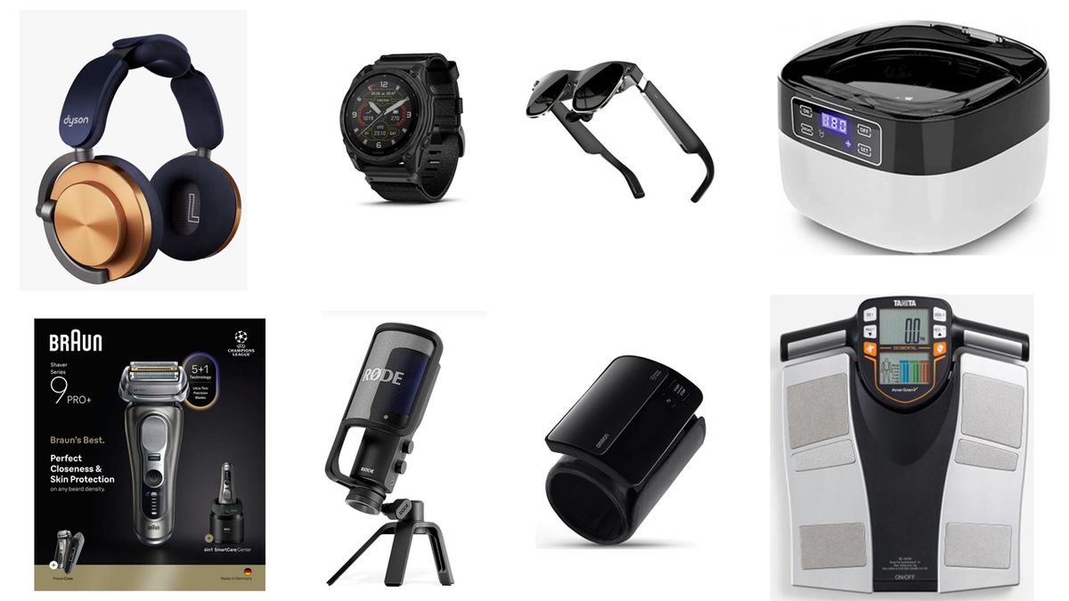 Sluchátka Dyson OnTrac (CNC měď), dokonalý zvuk, výdrž baterie až 55 hodin, 12 490 Kč; Chytré hodinky Garmin tactix 8 – 51 mm, Solar, s reproduktorem a mikrofonem pro hlasové funkce a možností potápění až do 40 metrů, 37 490 Kč; Brýle pro virtuální realitu XREAL Air 2 Ultra AR, 18 990 Kč; Ultrazvuková čistička Geti GUC 753, dokonale vyčistí brýle, šperky a další předměty, 1690 Kč; Holicí strojek Braun Series 9 PRO+ Wet&Dry 9675cc, 10 499 Kč; Mikrofon RODE NT-USB+, na stativ, 4099 Kč; Tlakoměr OMRON Evolv, bezkabelový a bezhadičkový tlakoměr, 4300 Kč; Osobní váha Tanita BC-545N, změří skutečné procento podílu tělesného tuku, vody či svalové hmoty v těle. Zjistí i bazální metabolismus a určí metabolický věk, viscerální tuk, hmotnost kostí, 5699 Kč