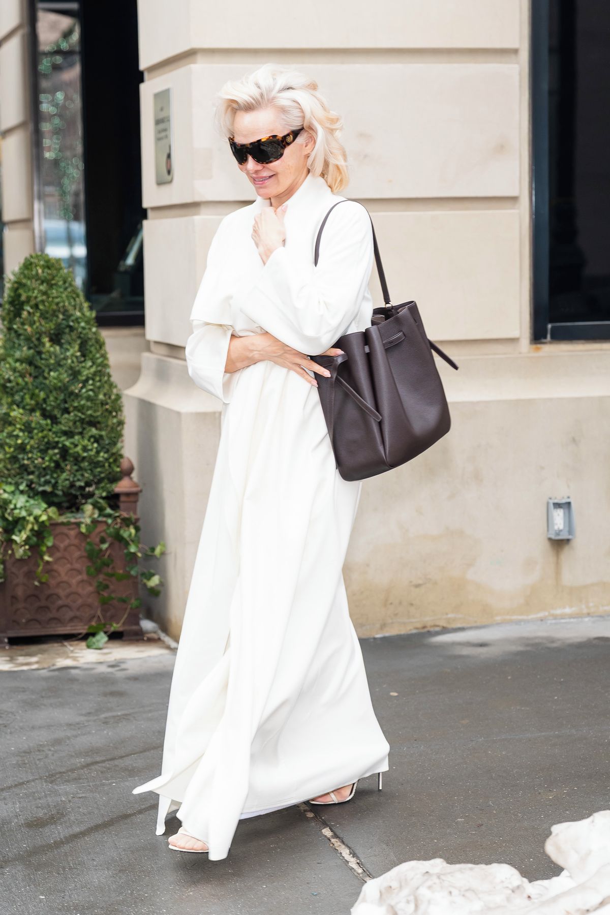 Hnědá kabelka ve tvaru vaku s pevným dnem, zvaná také bucket bag, perfektně ladí s bílým rozevlátým kabátem, sandály na podpatku a přirozeným make-upem herečky. Tento uvolněný boho styl je pro Pamelu příznačný. Stačí, aby přidala velké trendy brýle a rázem máte chuť ji v její módní volbě následovat.