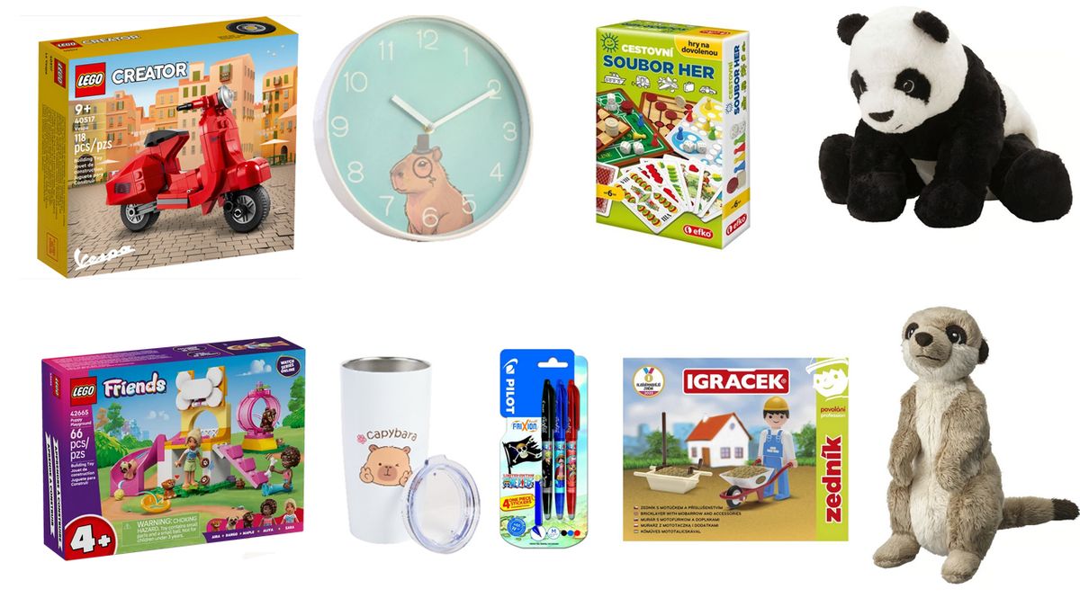 Lego Creator Vespa, 249 Kč; KiK Originální hodiny s Kapybarou, 99 Kč; Efko Cestovní soubor her - pro celou rodinu, 249 Kč; Ikea KRAMIG Plyšová hračka, panda, 99 Kč; Lego Friends Hřiště pro štěňátka, 239 Kč; KiK Termohrnek, 129 Kč; Pilot FriXion Ball 07 One Piece + samolepky, gumovací barevná pera, 199 Kč; Igráček Zedník - figurka s kolečkem a nářadím, 159 Kč; Ikea Sandlopare Plyšová hračka, surikata, 20 cm, 149 Kč