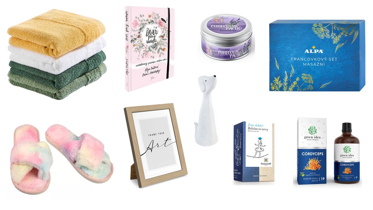 Hebké ručníky z bio bavlny s vysokou gramáží i savostí, XXXLutz 249 Kč; Diář plný radosti, Olga Bušková, luxor.cz 254 Kč; Nanolab - Přírodní pohlcovač pachů Od Babičky 300g , bionetta.cz 99 Kč; Alpa dárková sada Francovka, pro masáž a úlevu od bolestí kloubů i hlavy, dm.cz 239 Kč; Albi Duhové pantofle, 179 Kč; knor Rámeček Beech 12×17 cm, 77 Kč; Keramika Andreas Dekorace keramický bílý pes Ben, bovo.cz 249 Kč; Sonnentor Balzám na nervy - bylinná směs bio, bionetta.cz 95 Kč; Green idea Cordyceps, bezlihová tinktura, bionetta.cz 228 Kč