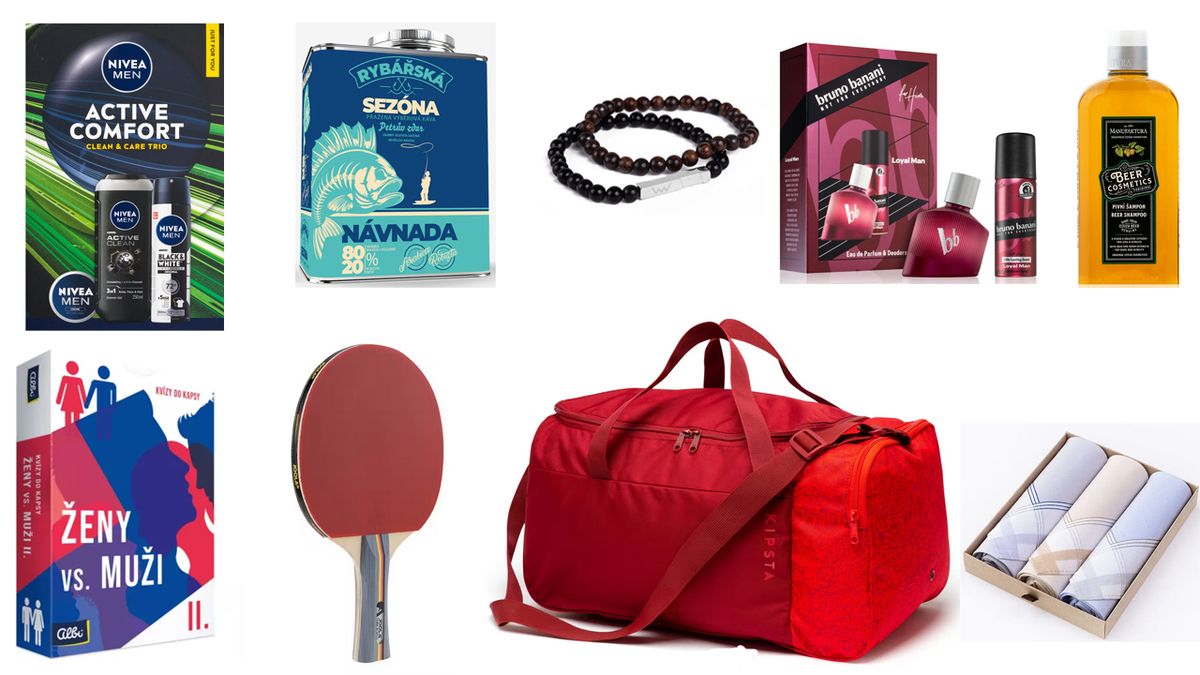 Nivea MEN dárková sada pro muže Active Comfort Clean & Care Trio, 249 Kč; Dárková káva Rybářská návnada, fixicoffee.cz od 249 Kč; Vuch Labaan pánské korále, vuch.cz 250 Kč; Bruno Banani Loyal Man EDP, parfémová voda 30 ml a deodorant, 239 Kč; Manufaktura Originální pivní šampon pro lesk a vitalitu 300 ml, 239 Kč; Albi Kvízy do kapsy - Ženy vs. muži II, albi.cz 134 Kč; Pálka na stolní tenis JOOLA Team School, Decathlon 229 Kč; Sportovní taška Essential 35 l, Decathlon 249 Kč; Matějovský Kapesníky Máš to v kapse, 219 Kč