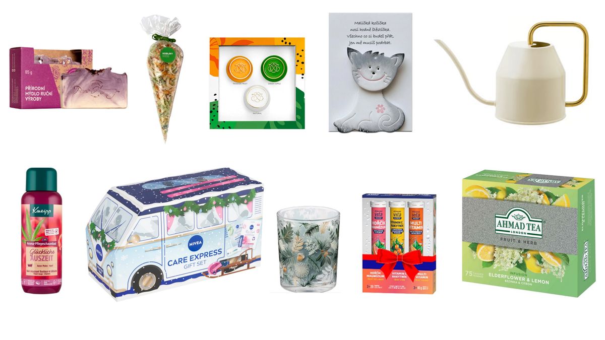 Pure Harmony Tuhé přírodní mýdlo Růže, 149 Kč; Caltha Mýdlové Meduňkové hobliny do koupele, 120 Kč; Oriflame Tender Care Sada Zázračných kelímků - přírodní, marakuja a zelené jablko, 229 Kč; Keramika Andreas Talisman kočka pro štěstí, bovo.cz 129 Kč; Konev Vattenkrasse, slonová kost/zlatá barva, 0.9 l, Ikea 179 Kč; Kneipp pěna do koupele Staré dobré časy, 400 ml, dm.cz 129 Kč; Nivea dárková sada Care Express, kompletní péči o pleť i rty, 199 Kč; Profissimo svíčka ve skle s potiskem, dm. cz 75 Kč; Exkluzivní dárkové balení Maxi Vita Exclusive Box od Vitaru, šumivé tablety s hořčíkem, vitaminem C a multivitaminem, nasevitaminy.cz 150 Kč; Ahmad tea Elderflower & Lemon, černý bez a citron,75 sáčků, 194 Kč