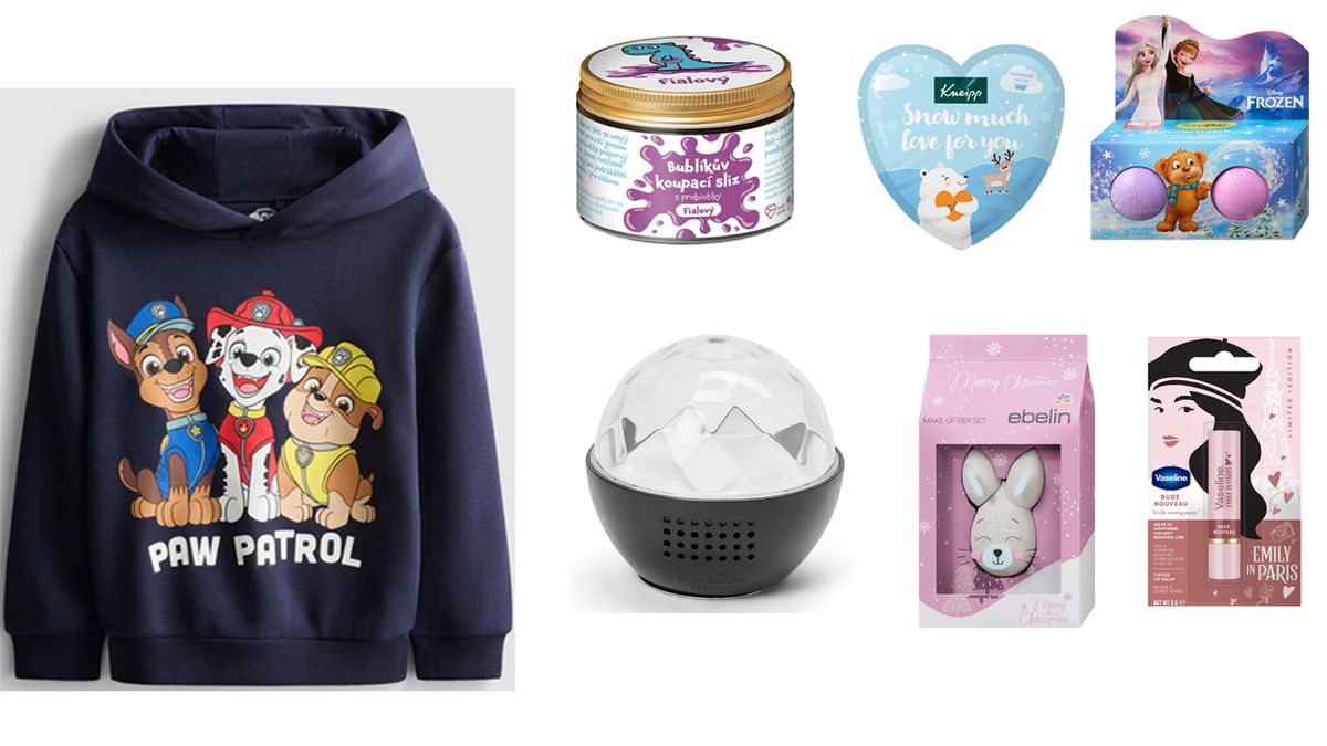 Mikina s kapucí PAW Patrol, Primark 235 Kč; Pure Harmony Bublíkův koupací sliz s probiotiky fialový, pureharmony.cz 139 Kč; Kneipp sůl do koupele Daruj srdce, 45 Kč; SauBär koupelová koule s hračkou Disney Frozen, 2 ks, dm.cz 149 Kč; Tchibo Mini diskokoule, tchibo.cz 249 Kč; ebelin sada make-up houbiček Merry Christmas, dm.cz 129 Kč; Vaseline balzám na rty Emily in Paris Nude, 139 Kč