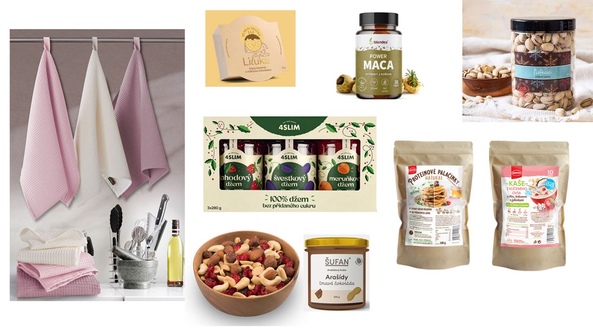 JIMI Textil Dárková sada 3ks vaflových utěrek - tóny fialové, textil-jimi.cz 169 Kč; Královna Liluk - liluka slaný karamel a sušenka mléčná, dokonalá souhra chutí, neobsahuje lepek, laktózu ani rafinovaný cukr, tonenimozny.cz 139 Kč; Maca extrakt 30 kapslí, pro hormonální rovnováhu, blendea.cz 174 Kč; Pistácie pražené solené 400g, dóza, zdraveorechy.cz 205 Kč; 4Slim Vánoční balení multipack 100% džemů - jahodový, švestkový, meruňkový, bez přidaného cukru, healthfactory.cz 200 Kč; Semix Kaše z klíčeného ovsa s chia, kokosem a jahodami bez lepku 500 g, zdravyzivot.com 89 Kč; Semix Proteinové palačinky Natural, lze připravit naslano i nasladko, zdravyzivot.com 147 Kč; Mix ořechů a brusnic 500g, zdraveorechy.cz 178 Kč; Šufan Arašídy s tmavou čokoládou, sufan.cz od 159 Kč
