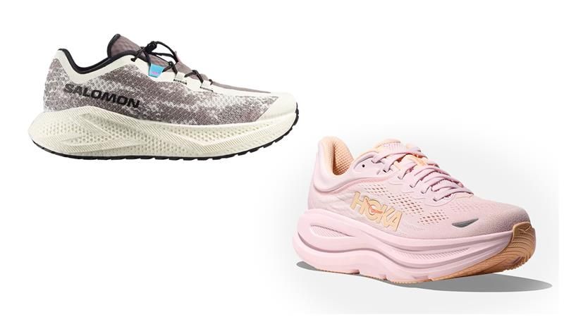 Tenisky na gravelový běh Aero Glide 4, Salomon, 4090 Kč; Dámské růžové tenisky Bondi 9, Hoka (Urbanlux), 4499 Kč