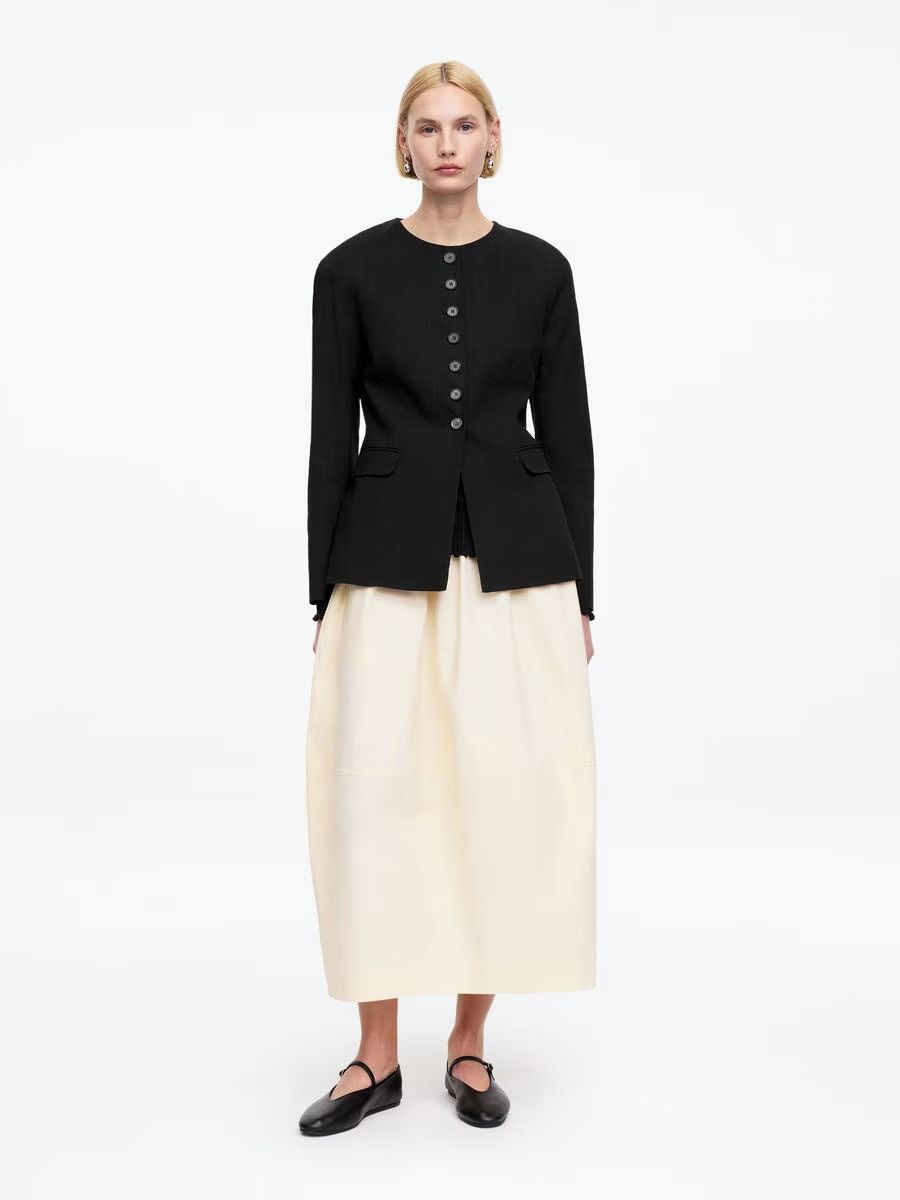 Tato módní sezona patří jednoduchosti. Po letech výrazných střihů, širší linie ramen a nápadných detailů přichází zklidnění v podobě saka bez klopy. Na první pohled nenápadný kousek se stává jedním z nejvýraznějších trendů, protože pracuje s čistou linií a minimalistickou estetikou, která působí moderně a nadčasově.